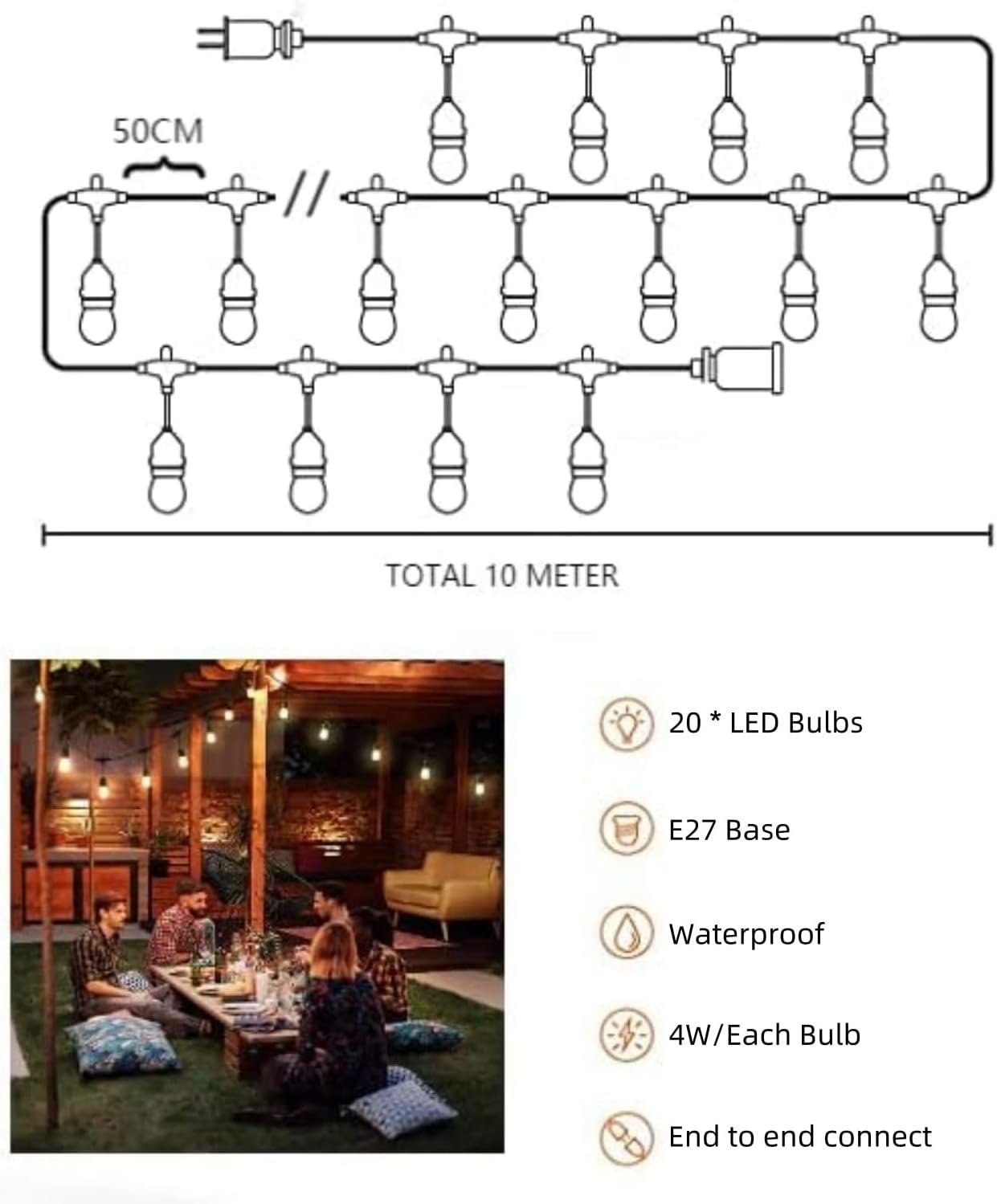 • 【33ft LED String Lights】This outdoor light comes with 20 LED bulbs. Each bulb is 50cm apart for a total length of 10 meters. It supports an end-to-end connection of up to 10 strings, allowing you to customize the length you need.
