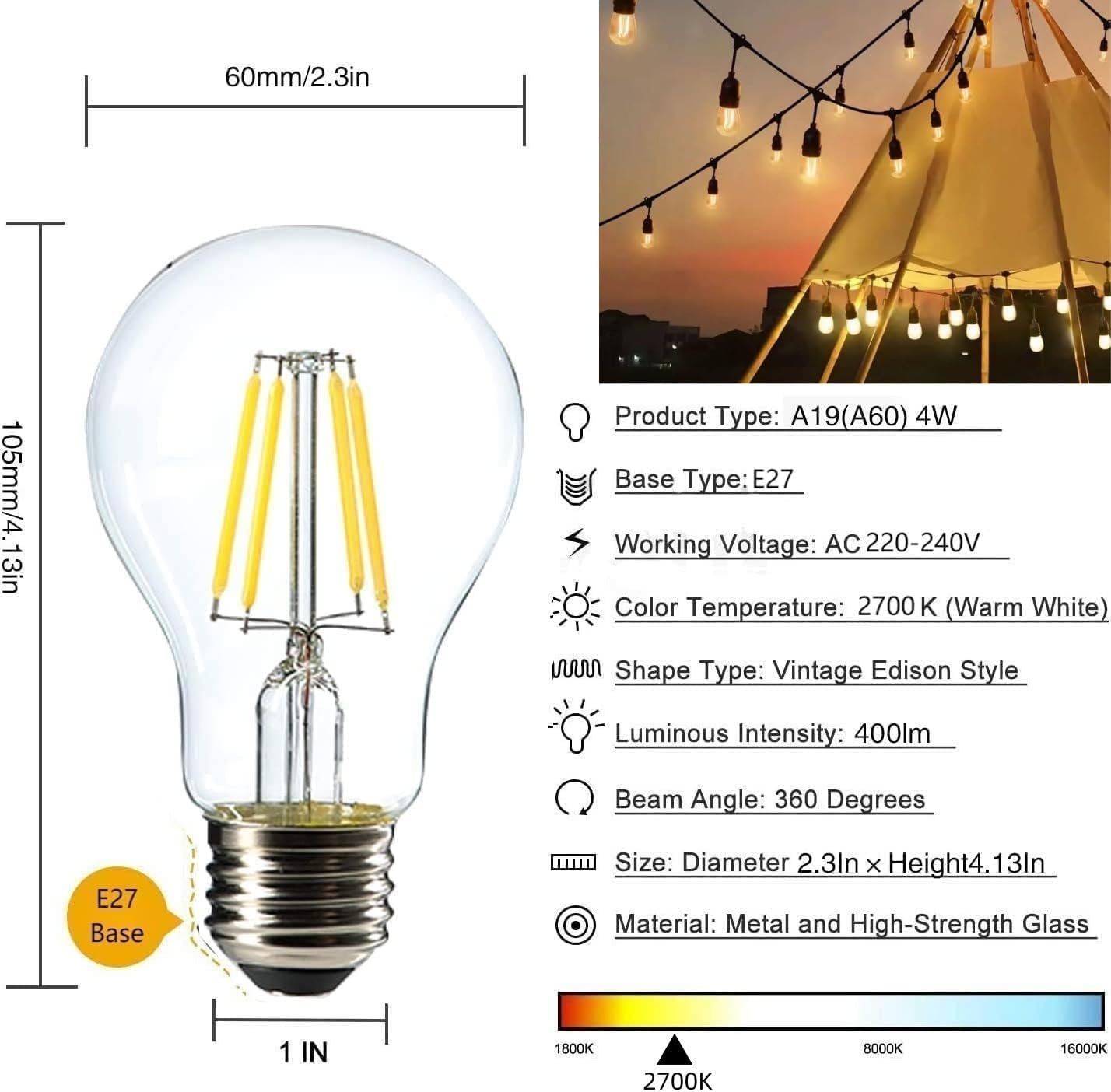 • 【Create an elegant】Romantic ambiance with outdoor LED string lights! These filament bulbs will instantly transform your space into a cozy, inviting retreat. Hang them as a canopy over your porch or gazebo for a retro bistro look and a pleasant party ambience. Make your outdoor space an enticing, relaxing, and soothing retreat with our LED outdoor string lights!